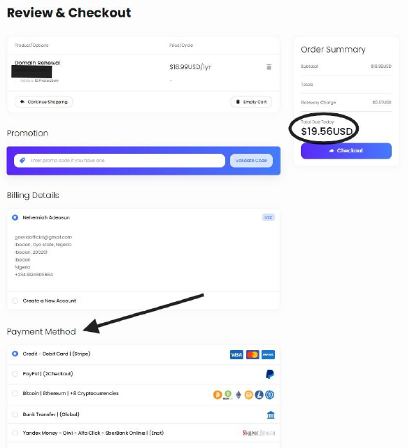 - Click on the Checkout button to proceed to the checkout page, where the total payable amount will be displayed in the right-hand column.