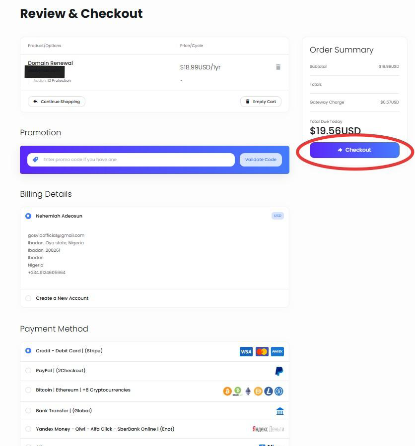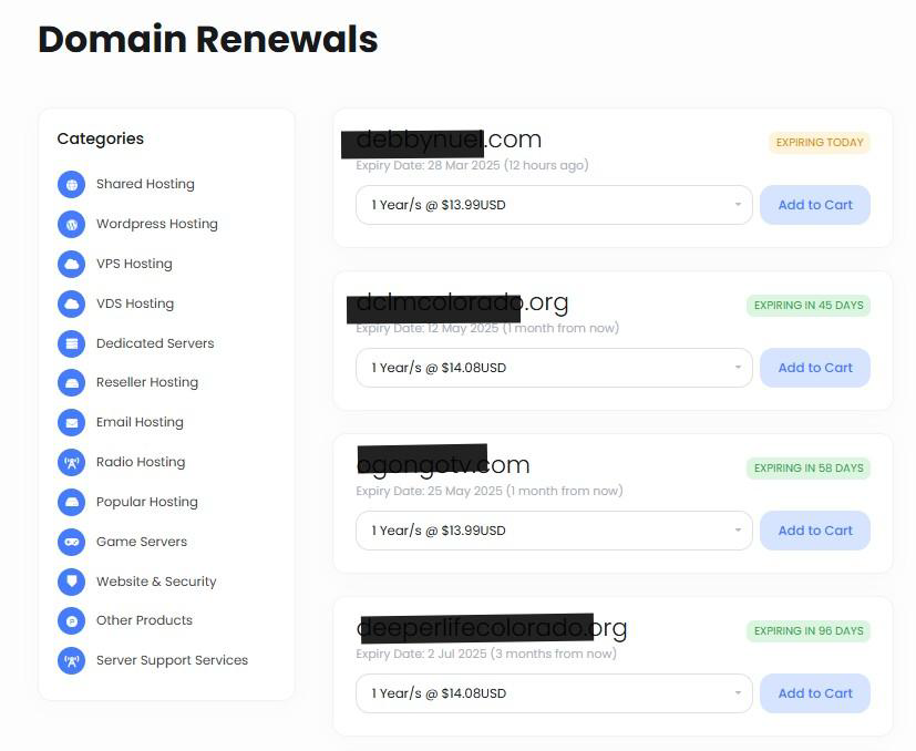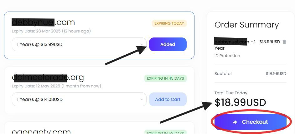 - You will be redirected to the Domain Renewal page, where all your domains are listed.