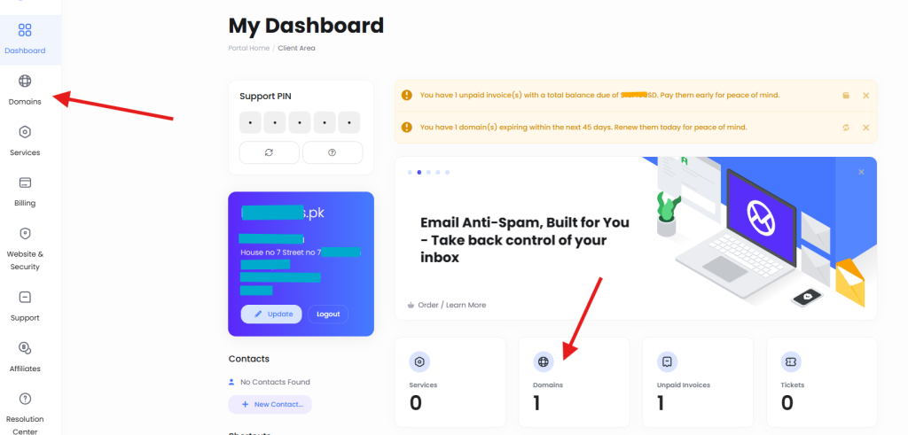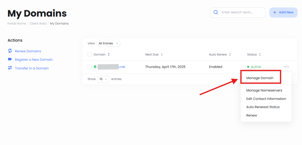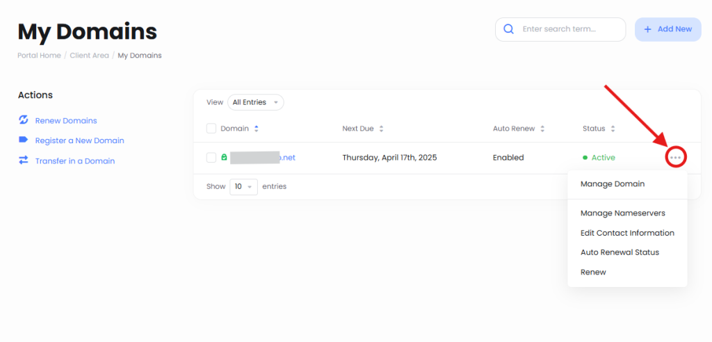 2. You’ll be taken to the My Domains page. Locate the domain you wish to manage and click on the three-dot menu next to it.