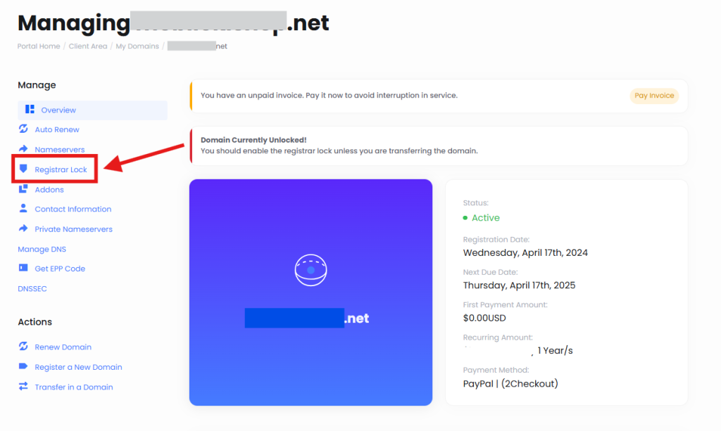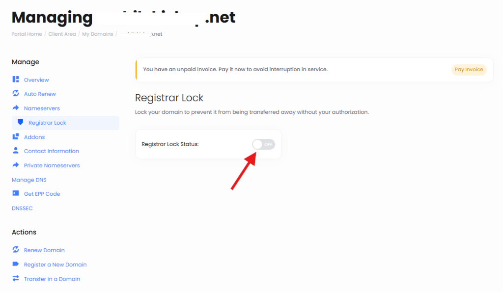 4. You’ll be directed to the domain management page. From here, click on “Registrar Lock”.